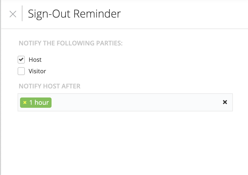 - configure the interval at which hosts are notified (via email) if visitors have not signed out (hosts can sign such visitors out).